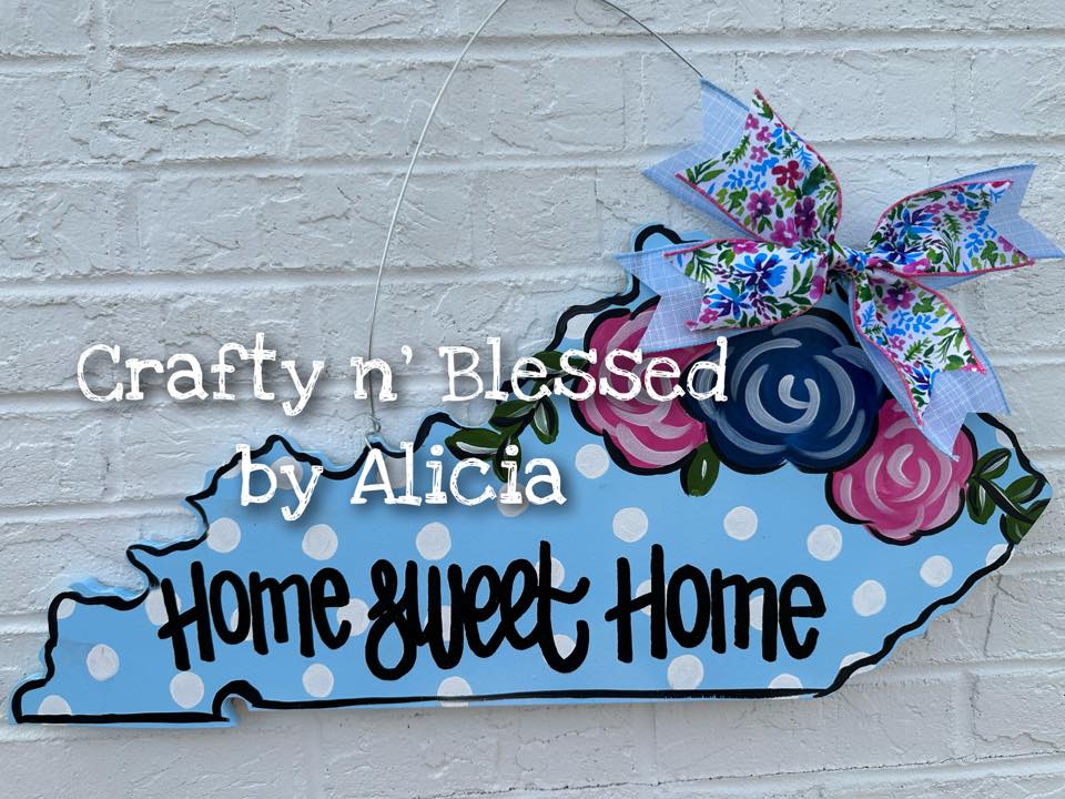 This kentucky measures approx 26" wide and hand painted on 1/2” plywood with acrylic paint and sealed with a clear gloss. Ribbon may vary depending on availability.
