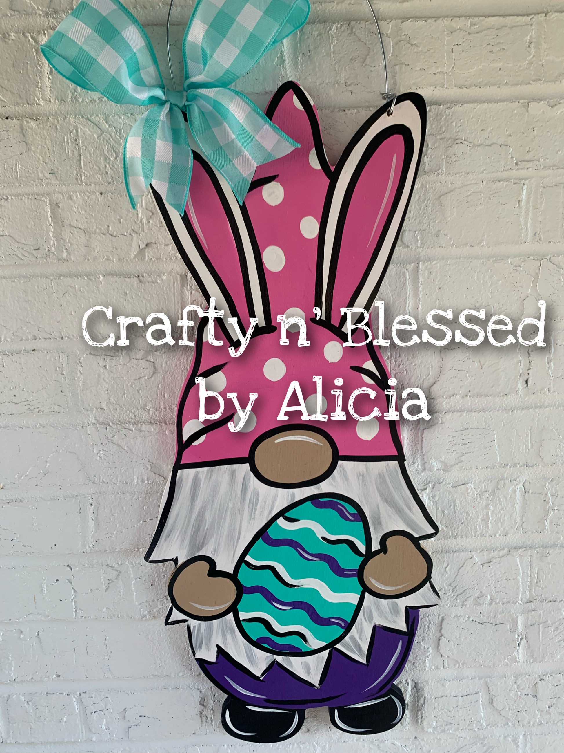 The gnomes are 24" tall and are hand painted on 1/2” plywood with acrylic paint and sealed with a clear gloss. Ribbon may vary depending on availability.