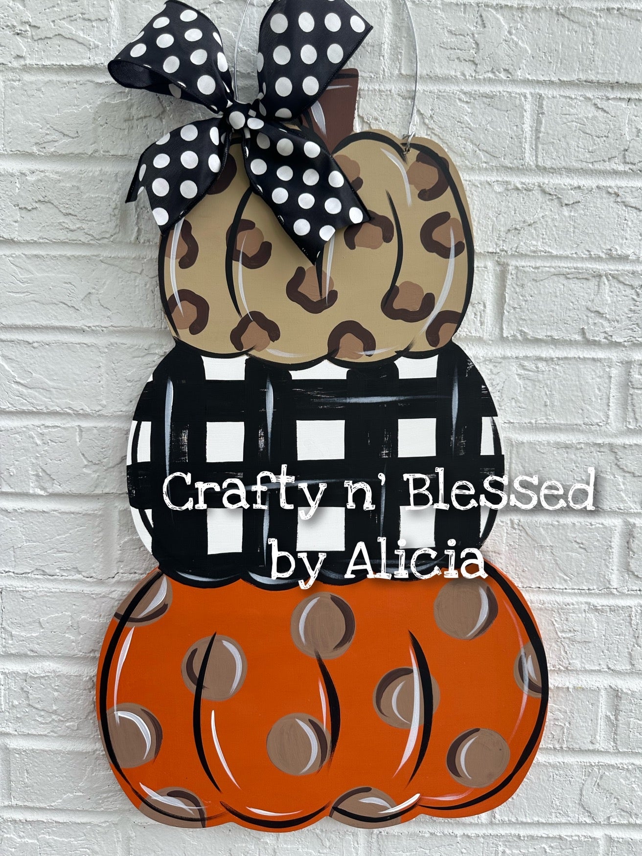 Cheetah Plaid Stacked Pumpkins Door Hanger