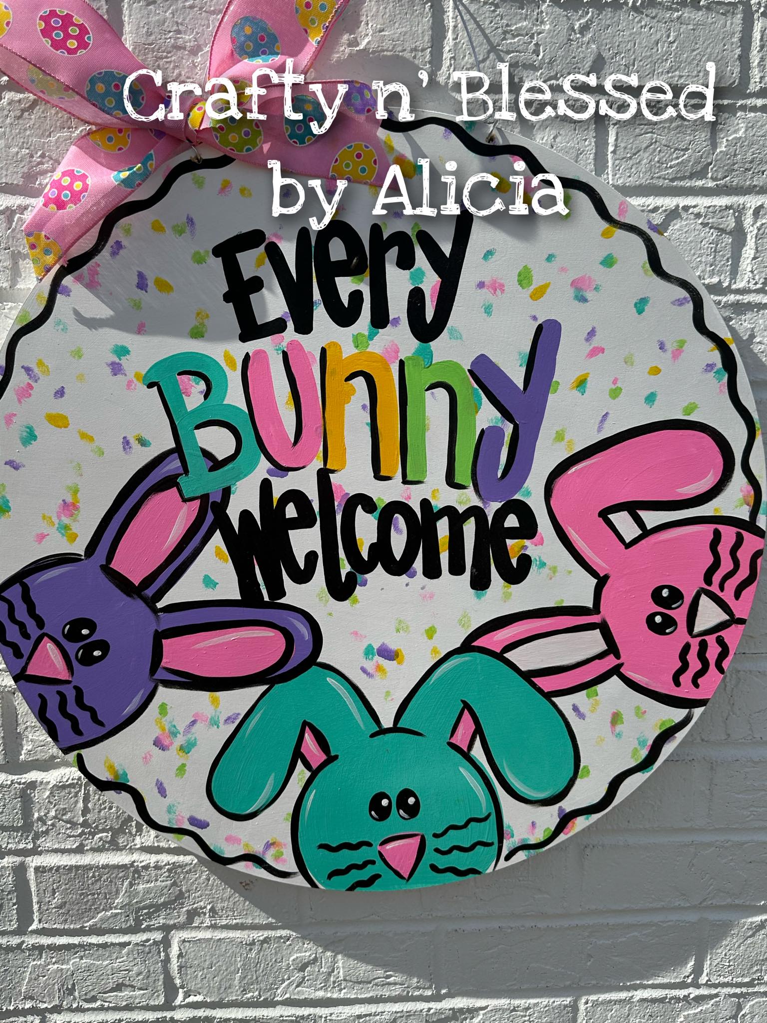 This circle measures approx 22" and hand painted on 1/2” plywood with acrylic paint and sealed with a clear gloss. Ribbon may vary depending on availability.