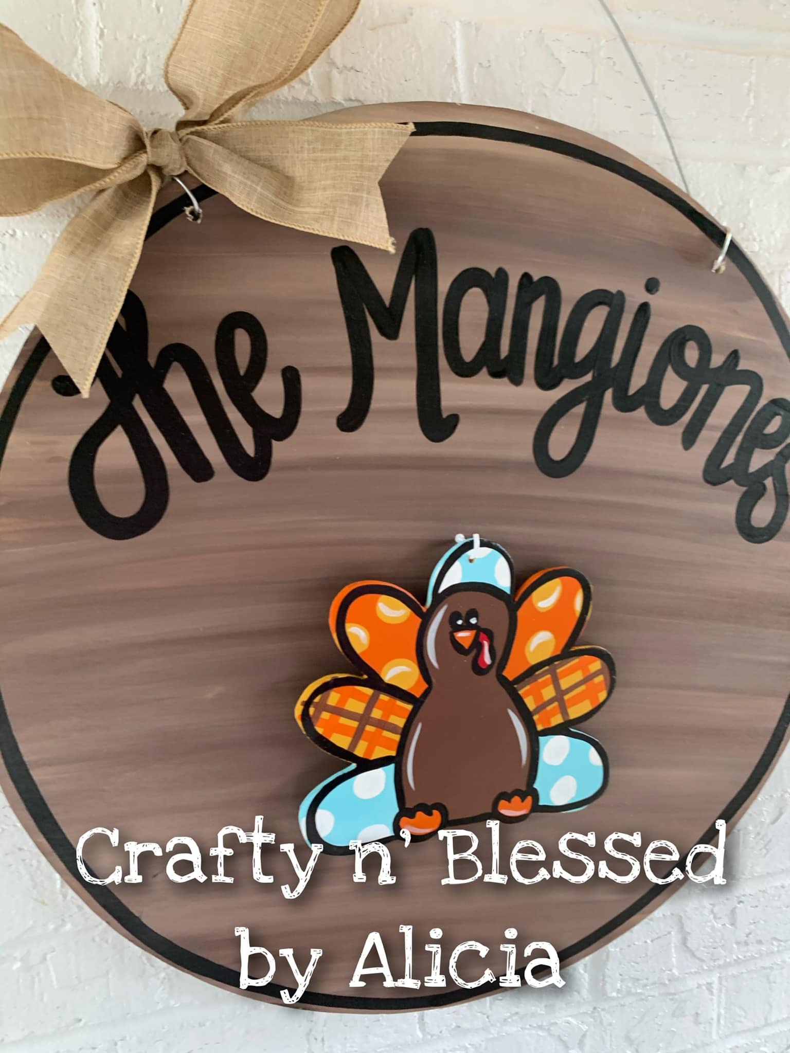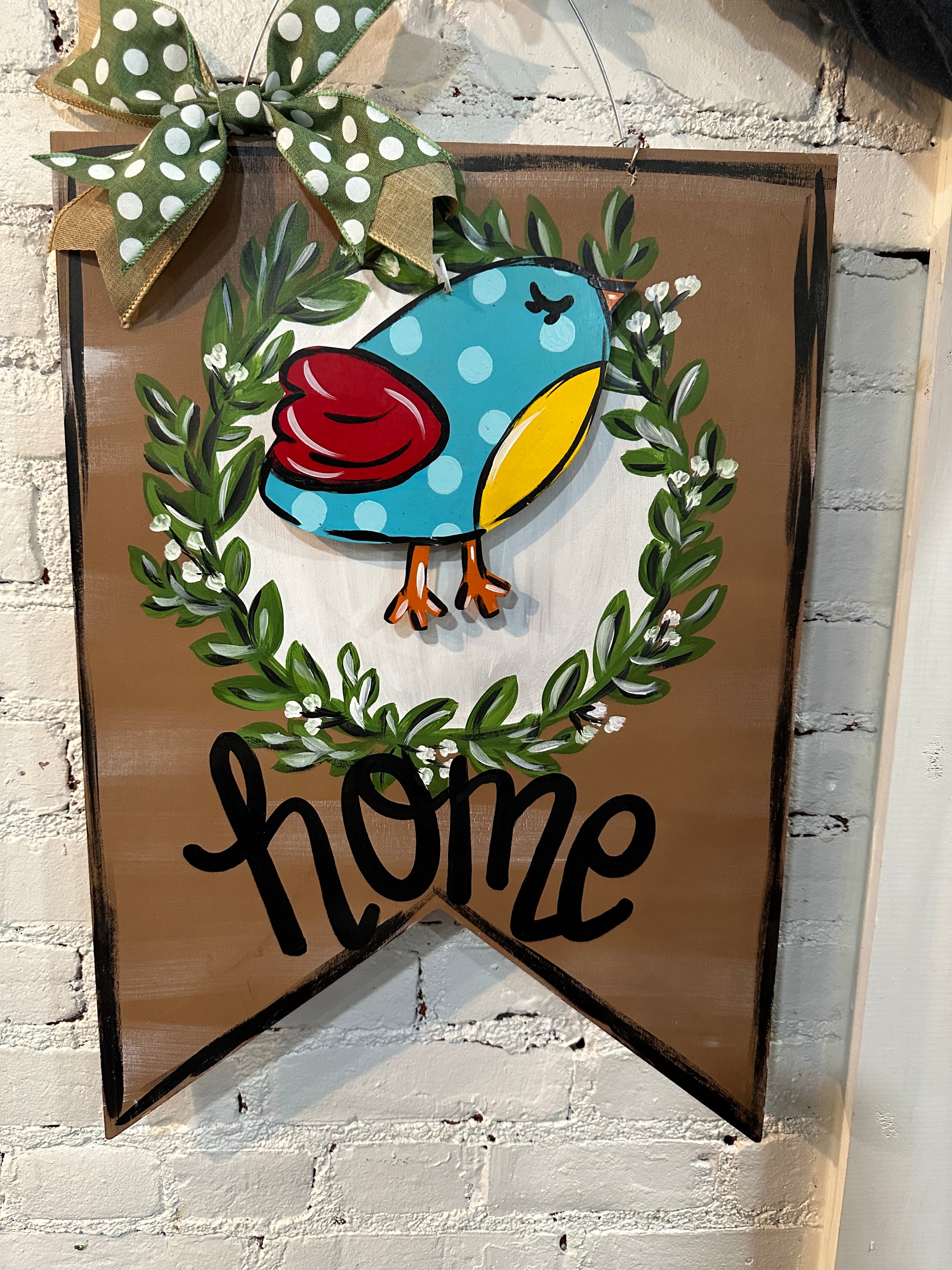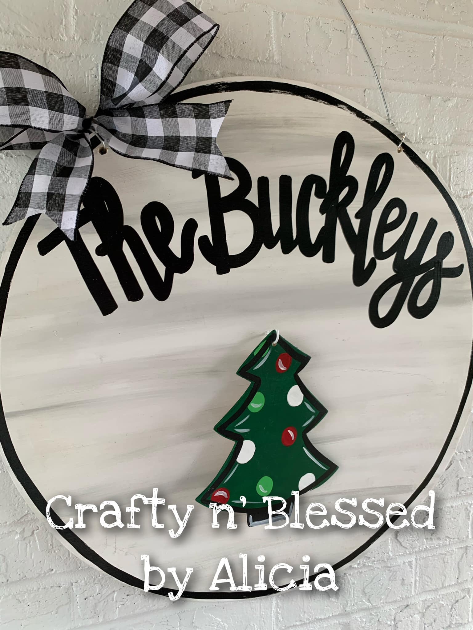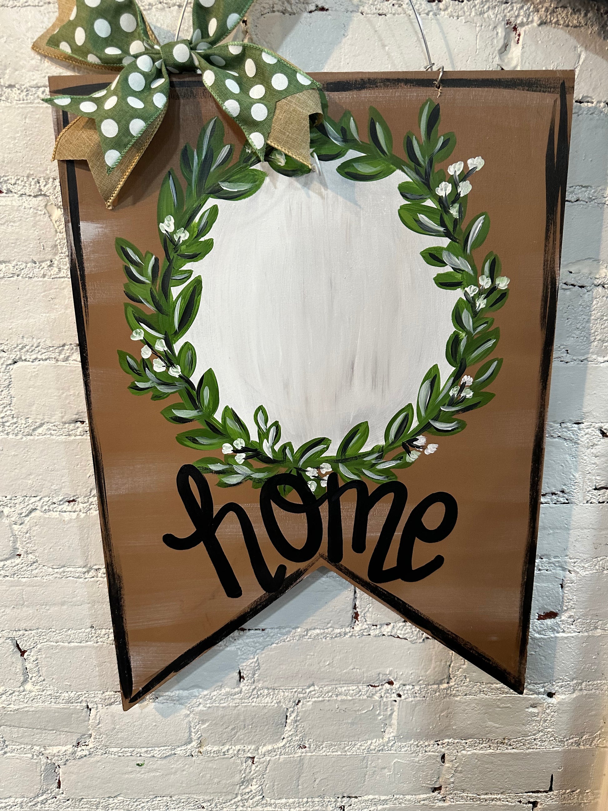 The Door Hanger option is hand painted on a 1/4" plywood shape and hung with a wire hanger and bow attached. These come in variety of sizes, 20" and 22" Circles and a pennant shape.