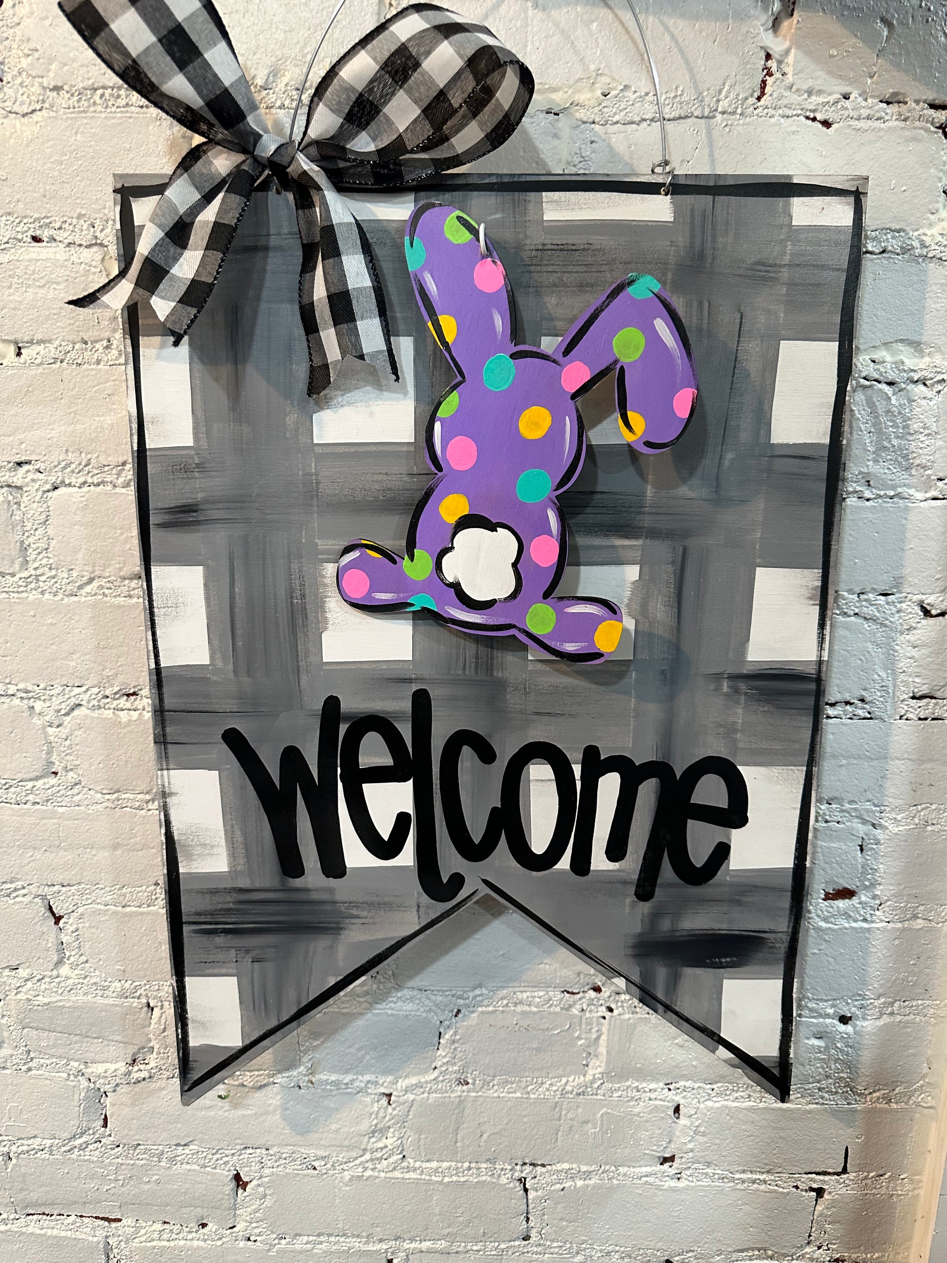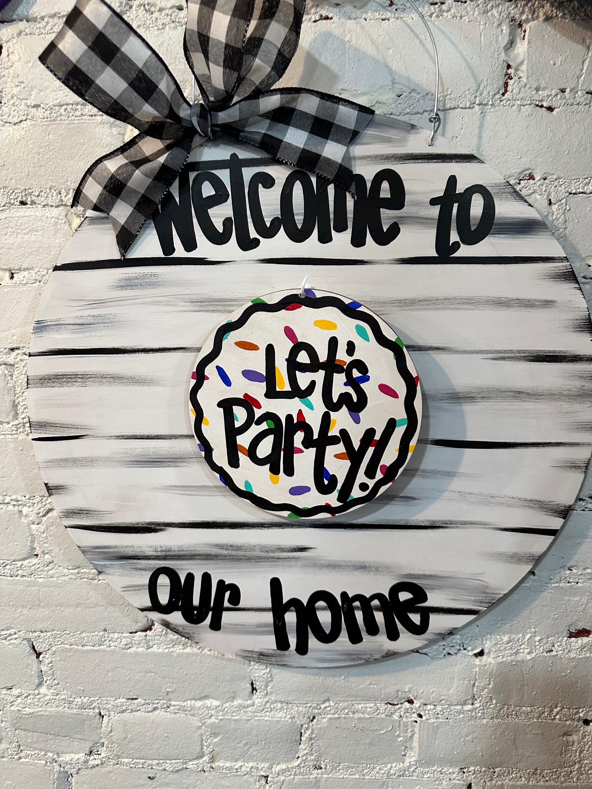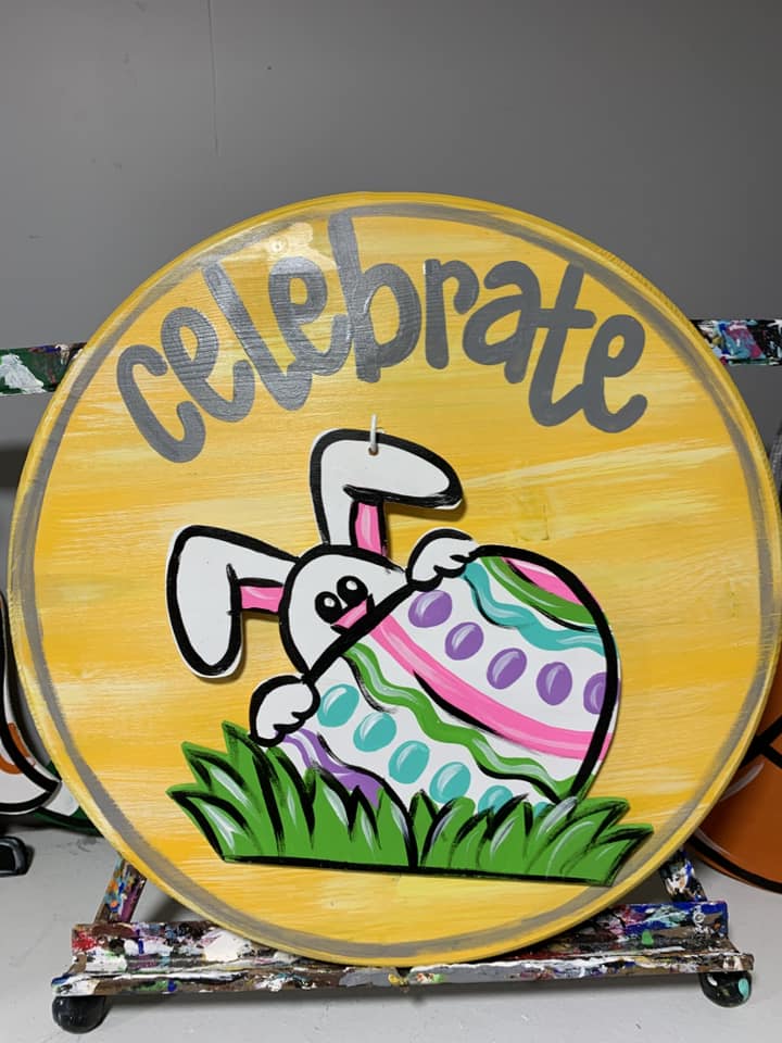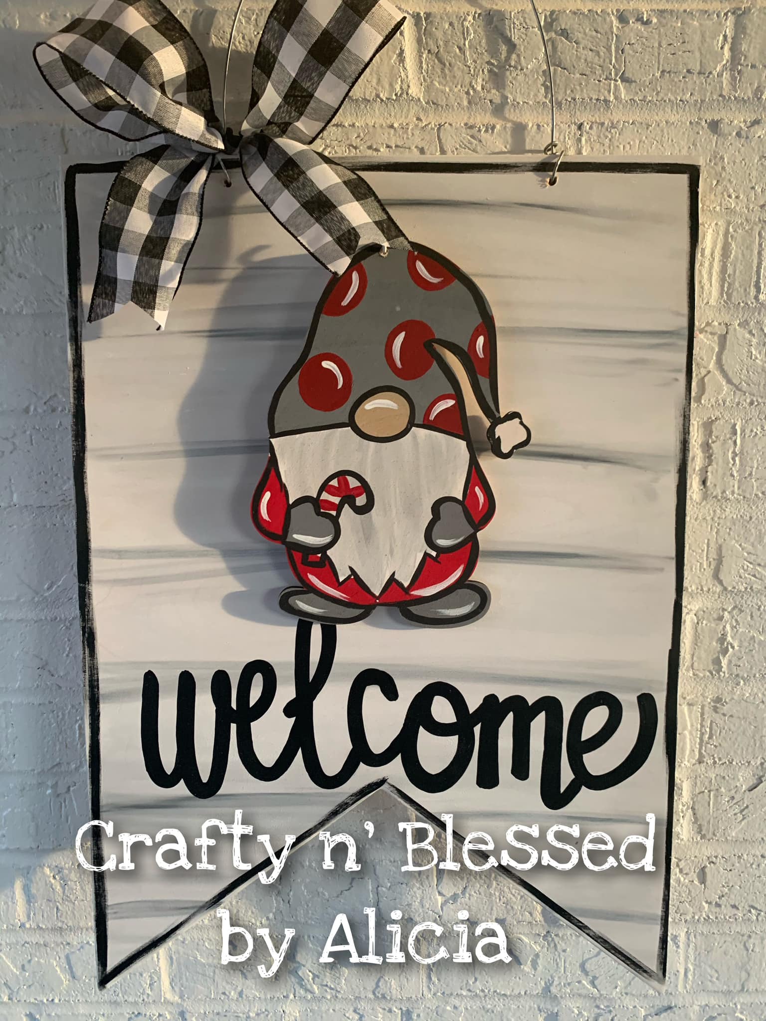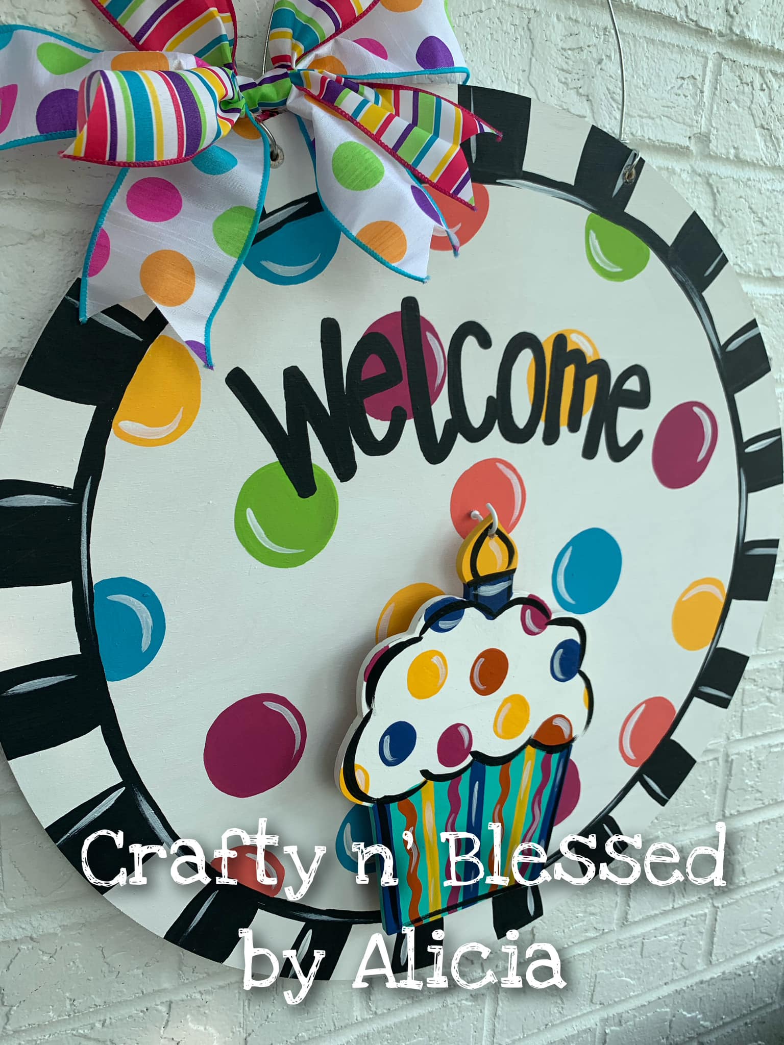 The Door Hanger option is hand painted on a 1/4" plywood shape and hung with a wire hanger and bow attached. These come in variety of sizes, 20" and 22" Circles and a pennant shape.
