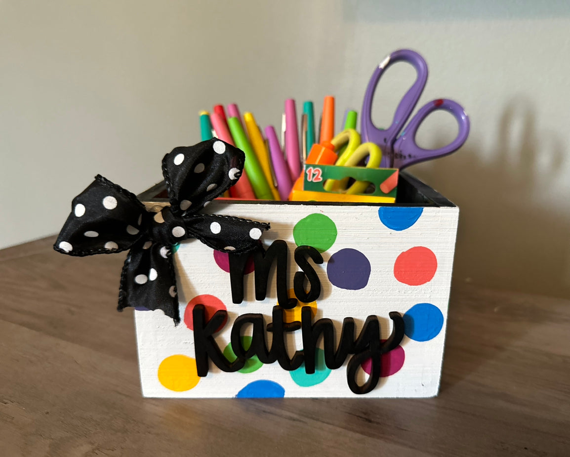 These are wood boxes, they are almost 6x6” wide and 4” tall and are hand painted with acrylic paint and sealed with a clear gloss. Ribbon may vary depending on availability. Names are hand drawn, cut, painted and glued on.