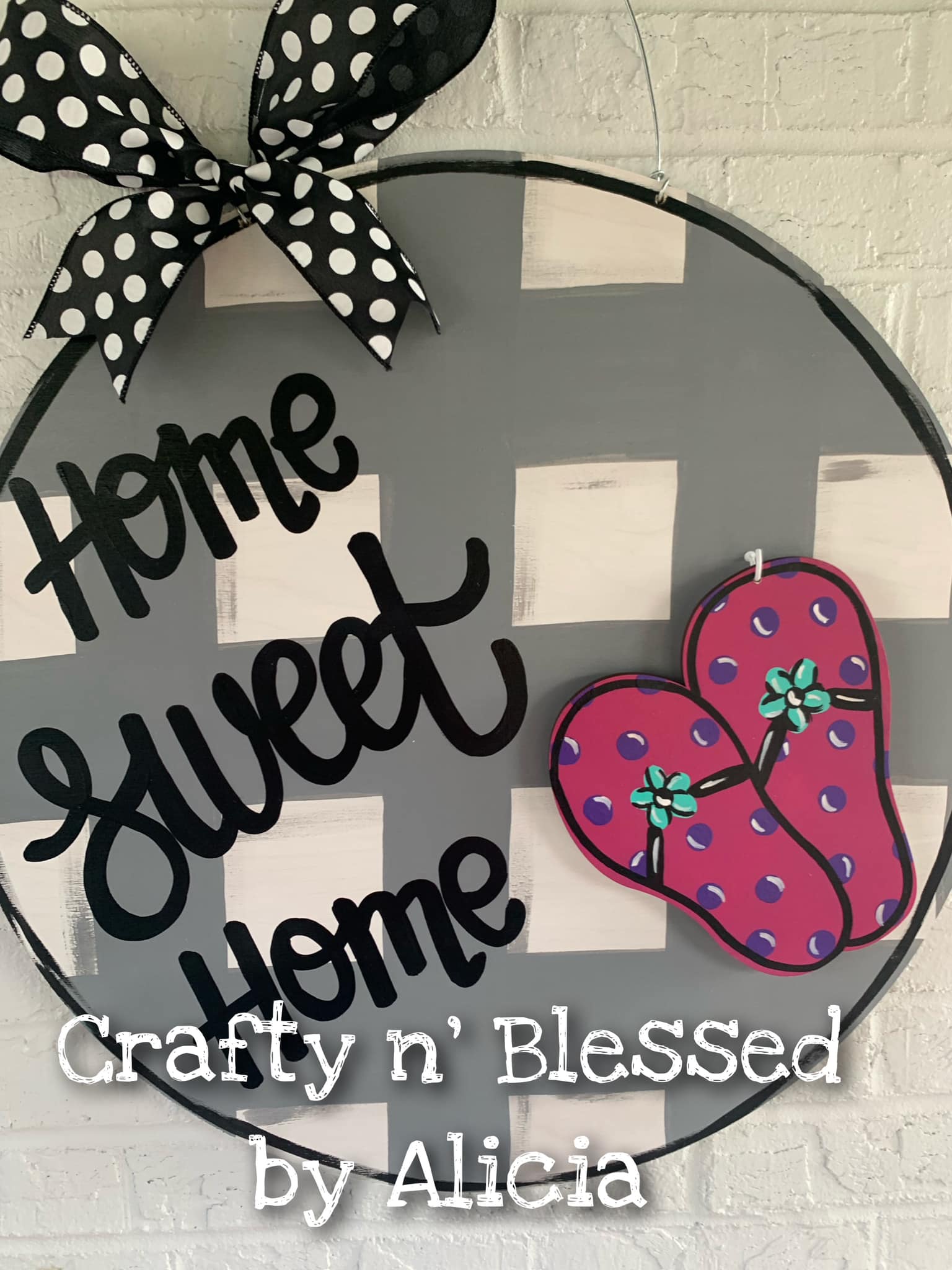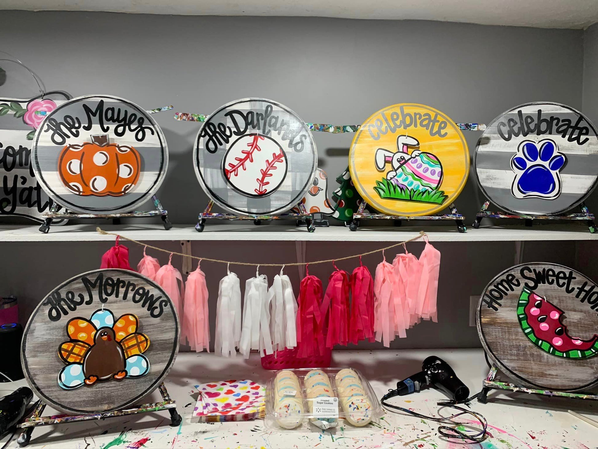 The Door Hanger option is hand painted on a 1/4" plywood shape and hung with a wire hanger and bow attached. These come in variety of sizes, 15", 20" and 22" Circles and a pennant shape.